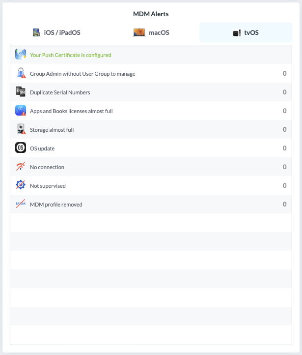 Mosyle Alerts provide Administrators important information regarding device status in the environment. In the Dashboard, default Alerts created by Mosyle are categorized by device type (iOS / iPadOS, macOS, tvOS) along with the number of affected devices.
