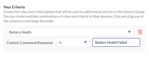 For example, if we are interested in the Battery Health of the devices in our fleet, a Custom Command can be used for criteria to retrieve the battery health information (Add Custom Alert > Add New Alert > New Custom Command). After entering the Custom Command, the expected response to add devices to the alert can be entered. In this example, we want to be alerted for devices with failed battery health so our expected response to the command is “Battery Health Failed”. The Custom Command will run on every Device Info to retrieve the current status of the device so it can be added or removed from the alert as needed.