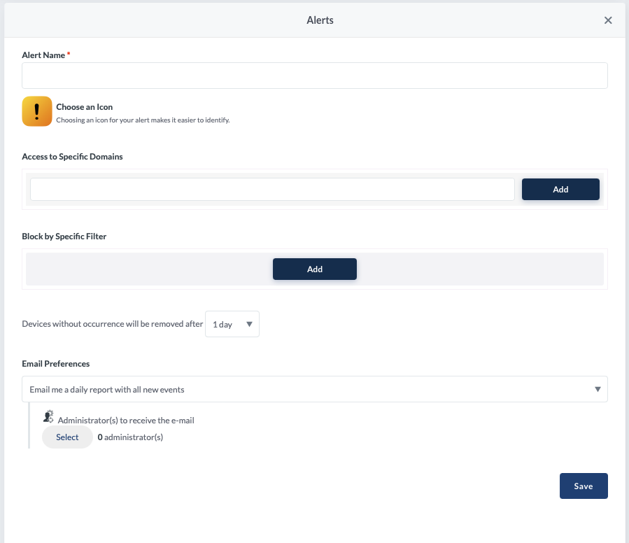 Name the Alert and choose an icon. Enter the specific domains or filter you wish to be alerted. Choose the frequency in which to receive emails and select the Administrators to receive the email alerts.