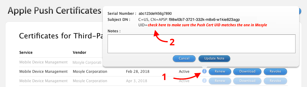 When renewing the Push Certificate, be sure to confirm the Push Certificate ID in Apple's Push Portal to make sure it matches the topic UDID shown in the Mosyle interface. If it's not possible to renew the original Push Certificate, the devices will need to be re-enrolled in Mosyle.
