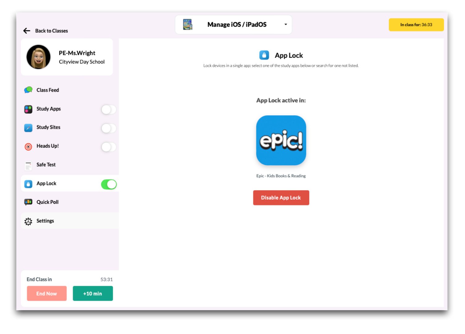 The App Lock feature allows teachers to quickly lock student devices into a specific app, preventing students from navigating to other resources or applications. The App Lock configuration will be applied to all students in the class when it is turned on.