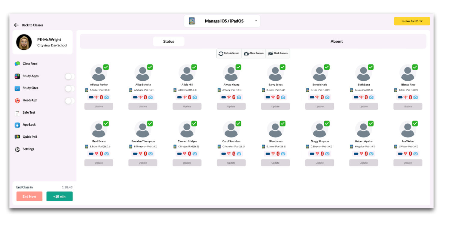 After the class is started, teachers will see a list of their students along with the name of the device assigned to the user. Additional information such as battery level, WiFi, Bluetooth status, and Camera access will be displayed. Teachers can click "Send Push" to call the device to the MDM to retrieve any pending commands. Click "Refresh Screen" to refresh the class roster view. - Absent