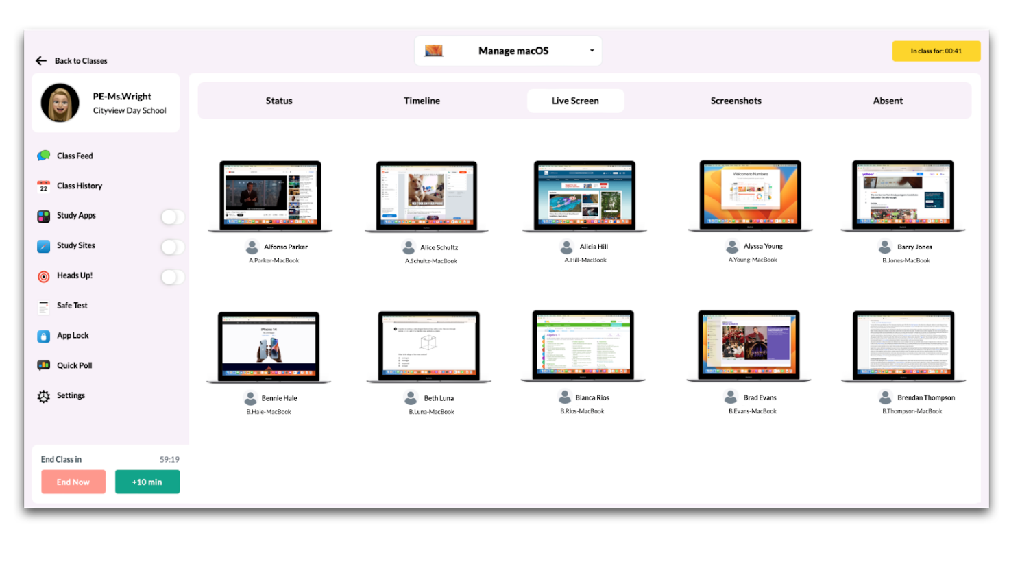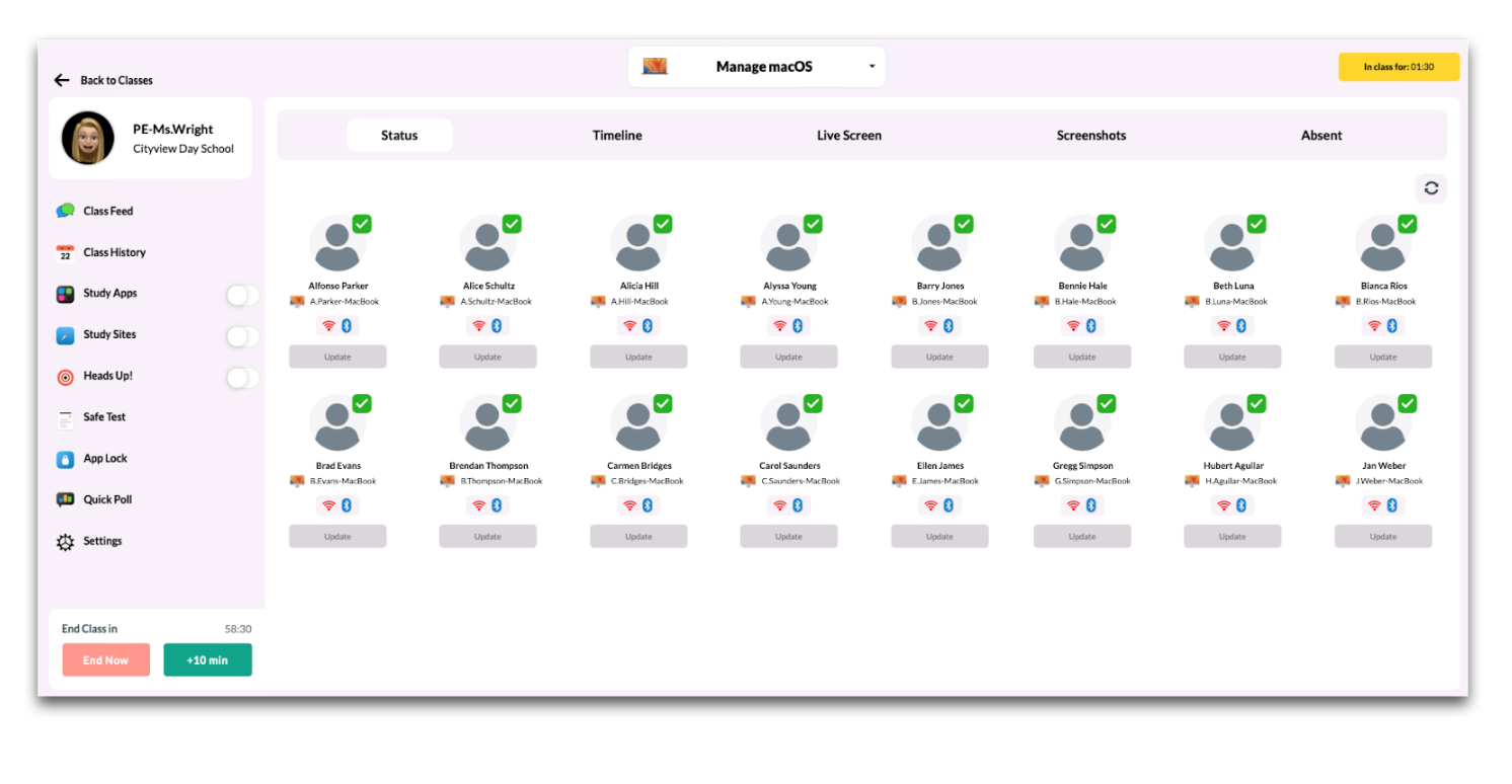 After the class has started, teachers will see a list of their students along with the name of the device assigned to the user. Additional information such as WiFi and Bluetooth status will be displayed, along with the option for the teacher to "Send Push" to call the device to the MDM to retrieve any pending commands. - Timeline (macOS only)