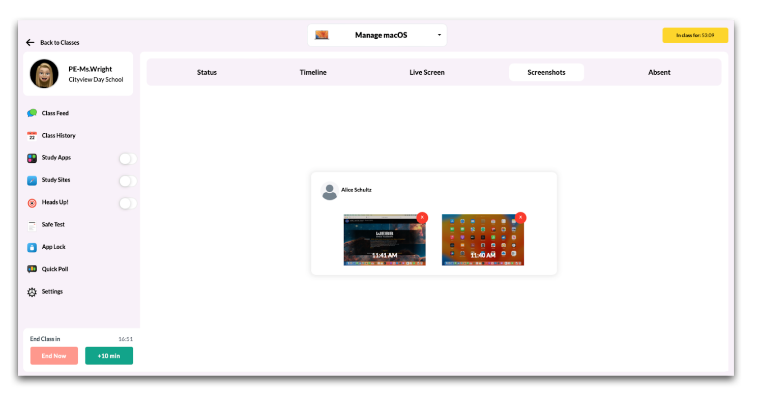 Any and all screenshots of student devices will be accessible to view in the Screenshots tab or in Class History.