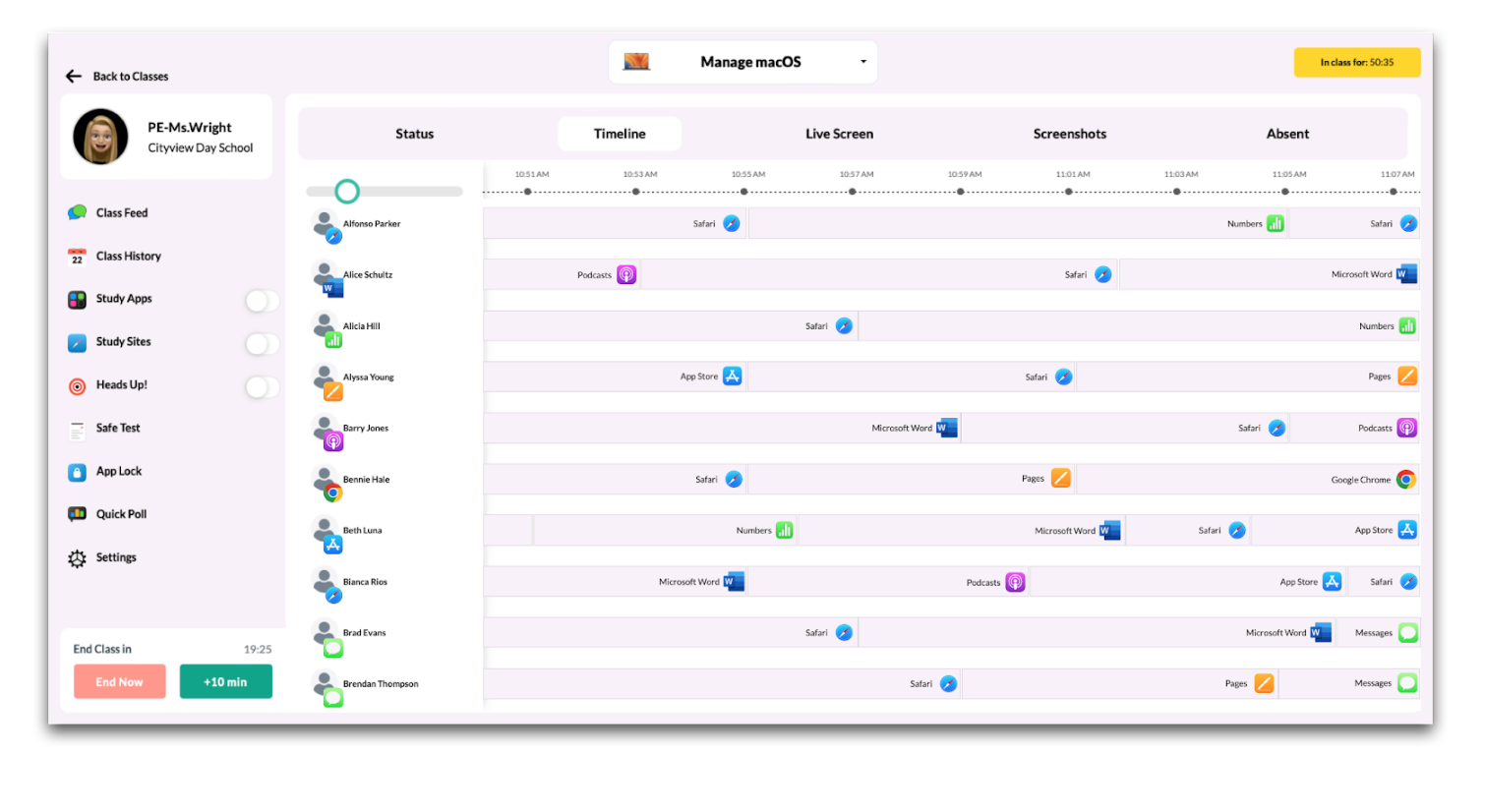 View a chronological timeline of student interactions with applications installed on the Mac. To the right of each student's name is a chart displaying the applications accessed during class and the duration each was open. Only the application that is present in the foreground on the Mac will be displayed. The Timeline is updated every 5 seconds. -