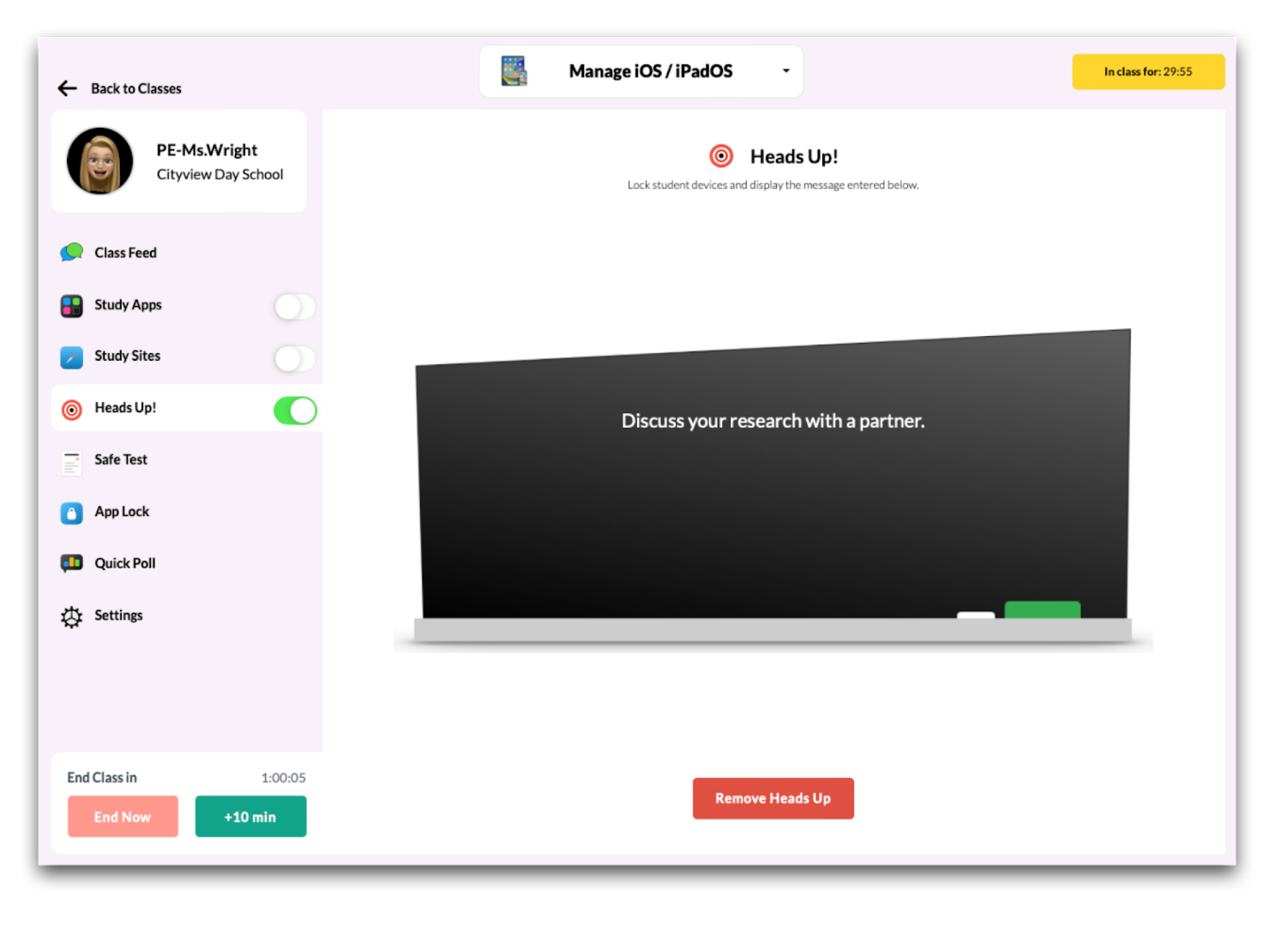 The Heads Up feature allows teachers to quickly disable/lock student devices to gain attention during a lesson or explanation. The Heads Up configuration will be applied to all students in the class when it is turned on.