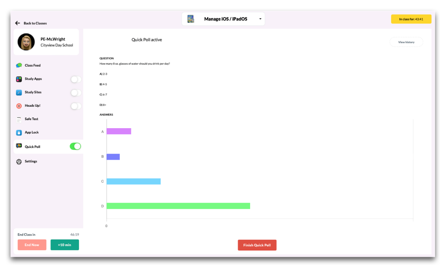 After the Quick Poll is applied, student devices will be locked into the Mosyle Manager application until they provide a response to the Quick Poll or until the class ends. Teachers will be directed to a screen that will show students responses in real-time.