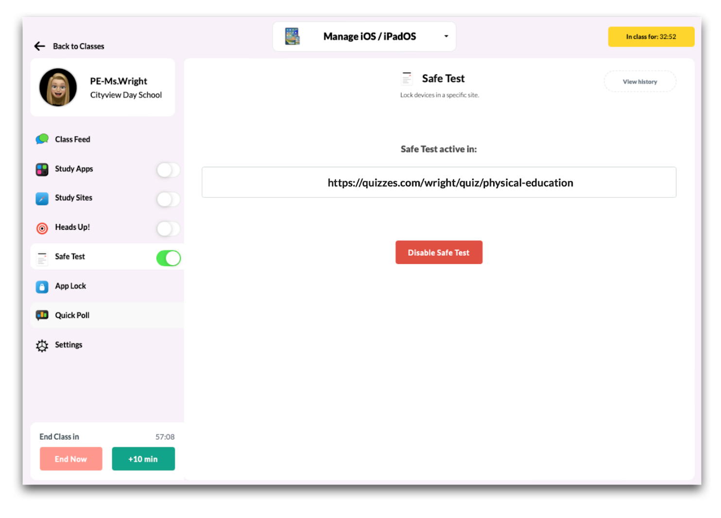 The Safe Test feature allows teachers to quickly lock student devices into a specific website, preventing students from navigating to other online resources or browsing the Internet. The Safe Test configuration will be applied to all students in the class when it is turned on.