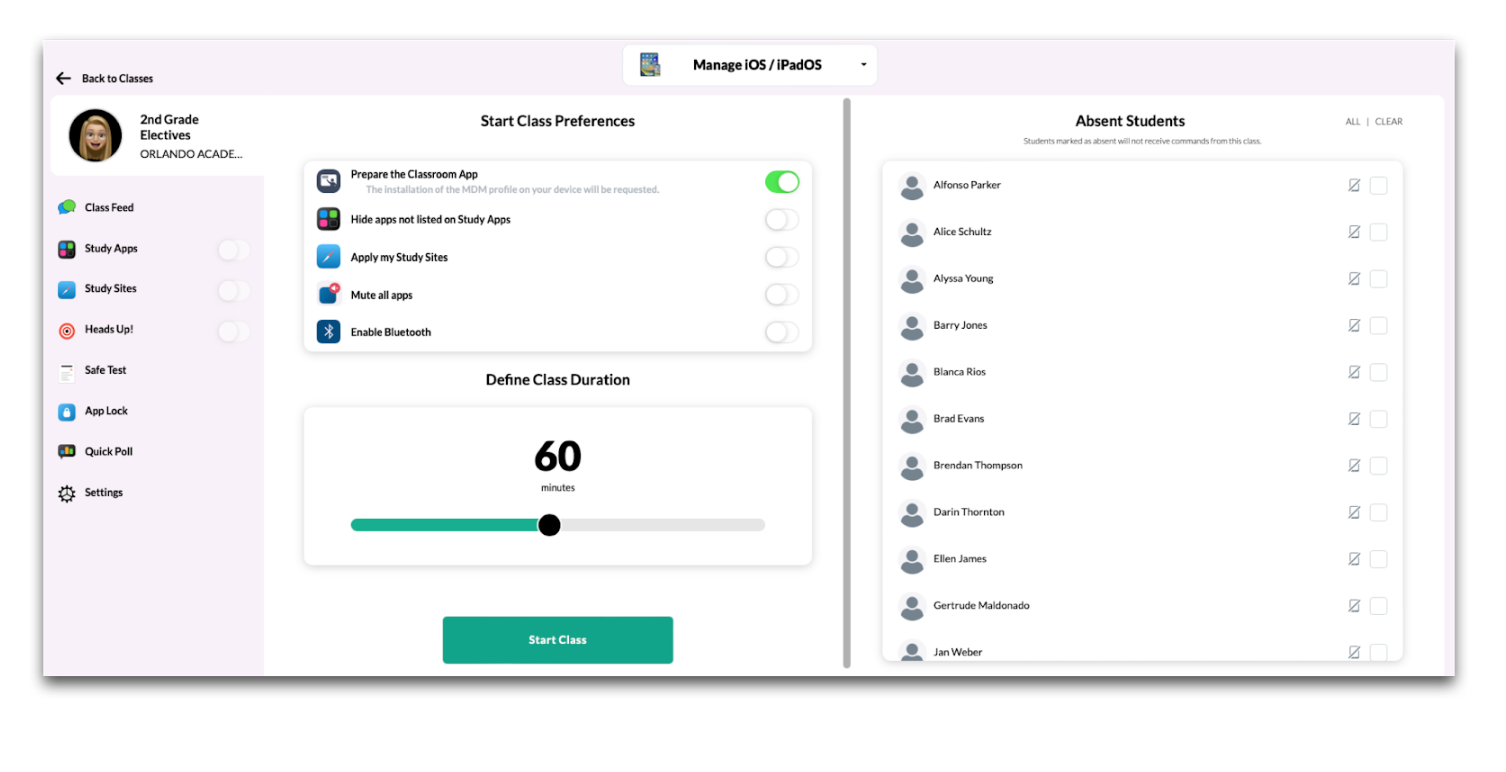 Toggle on the option to immediately hide or block all applications installed on student devices that are not listed in the Study Apps list after clicking “Start Class”. On iOS and iPadOS devices, apps not selected in Study Apps will be hidden. On macOS devices, apps not selected in Study Apps will be unable to launch.