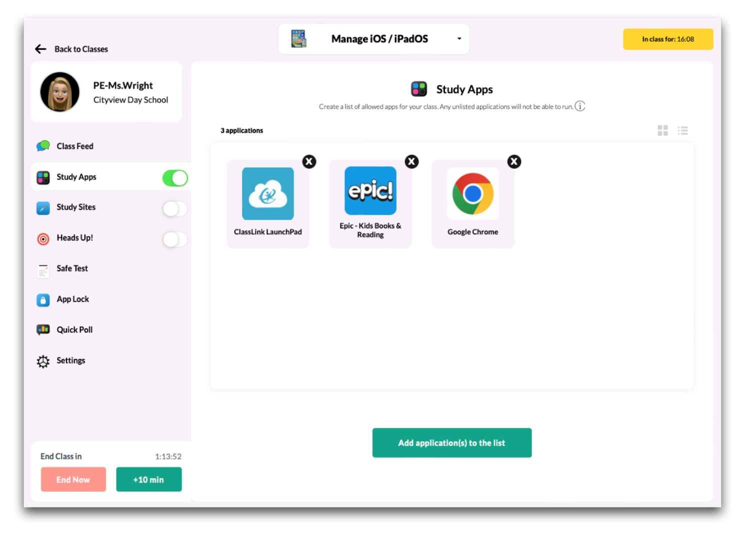 Apply the Study Apps list to classes after they have been started by toggling on the Study Apps option in the menu. Toggle off at any time to remove Study Apps.