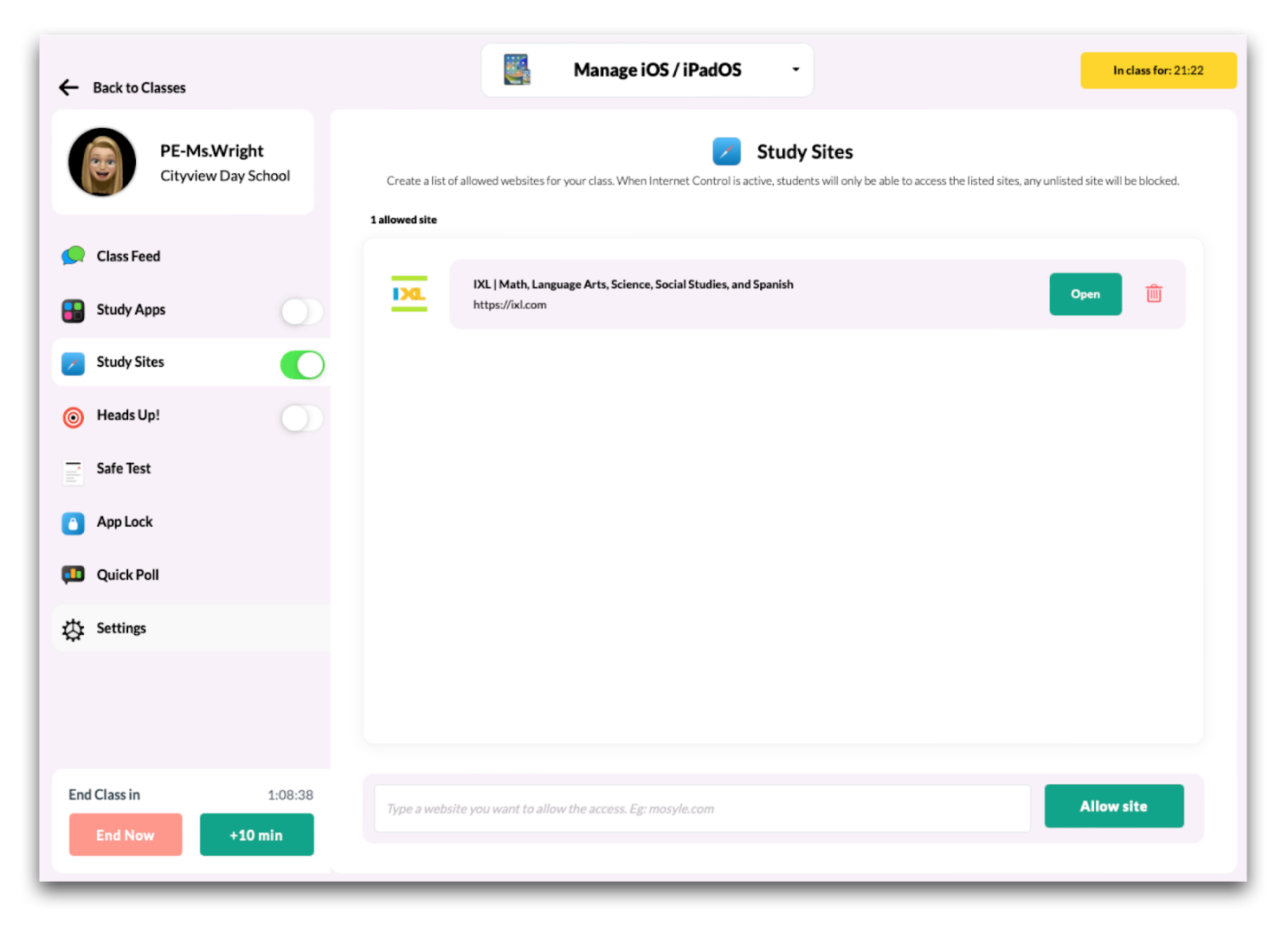 The Study Sites feature allows teachers to create a list of allowed websites for each class, allowing customization of website access based on the unique characteristics of each group of students. The Study Sites configuration will be applied to all students in the class.