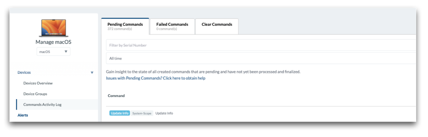 The Commands Activity Log provides an overview of all pending and failed commands. Filter commands, send a push to the devices, or clear specific commands with a few clicks. To access the Commands Activity Log, go to Management > Devices > Commands Activity Log.
