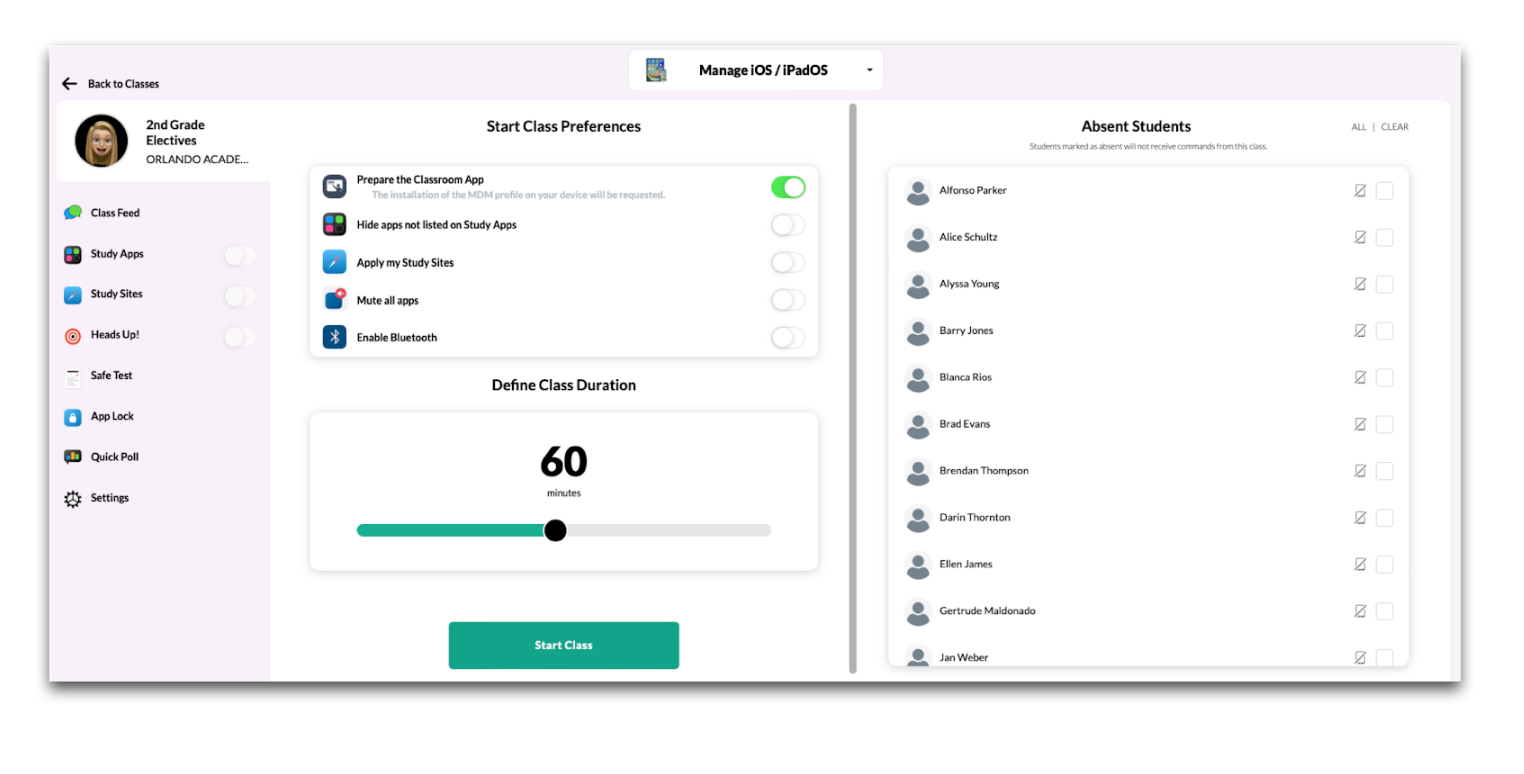 Mosyle's Class Manager offers teachers a specialized tool to ensure students are focused on learning by providing a core set of functionalities for classroom tasks. It also empowers teachers to disable or allow the camera, enable Bluetooth, verify devices are compliant with teacher defined policies, and ensure that Apple Classroom is automatically configured to be used in conjunction. Class Manager works across any network so it's a great tool to use with Apple Classroom when students are face to face or standalone when they are in remote learning.