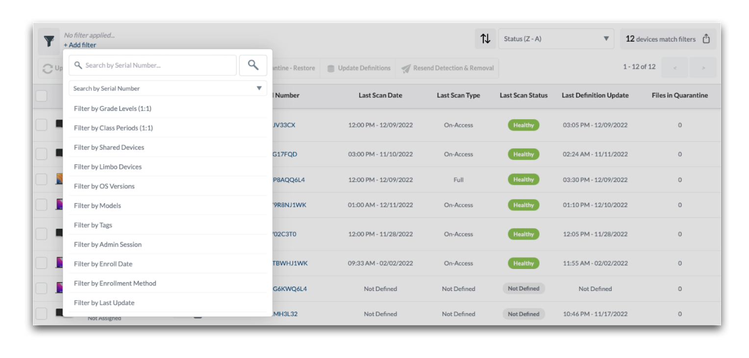 Sort the list of devices by the device name, files in quarantine, last definition update, last scan date, last scan type, serial number, status, tags, or compliance percentage.