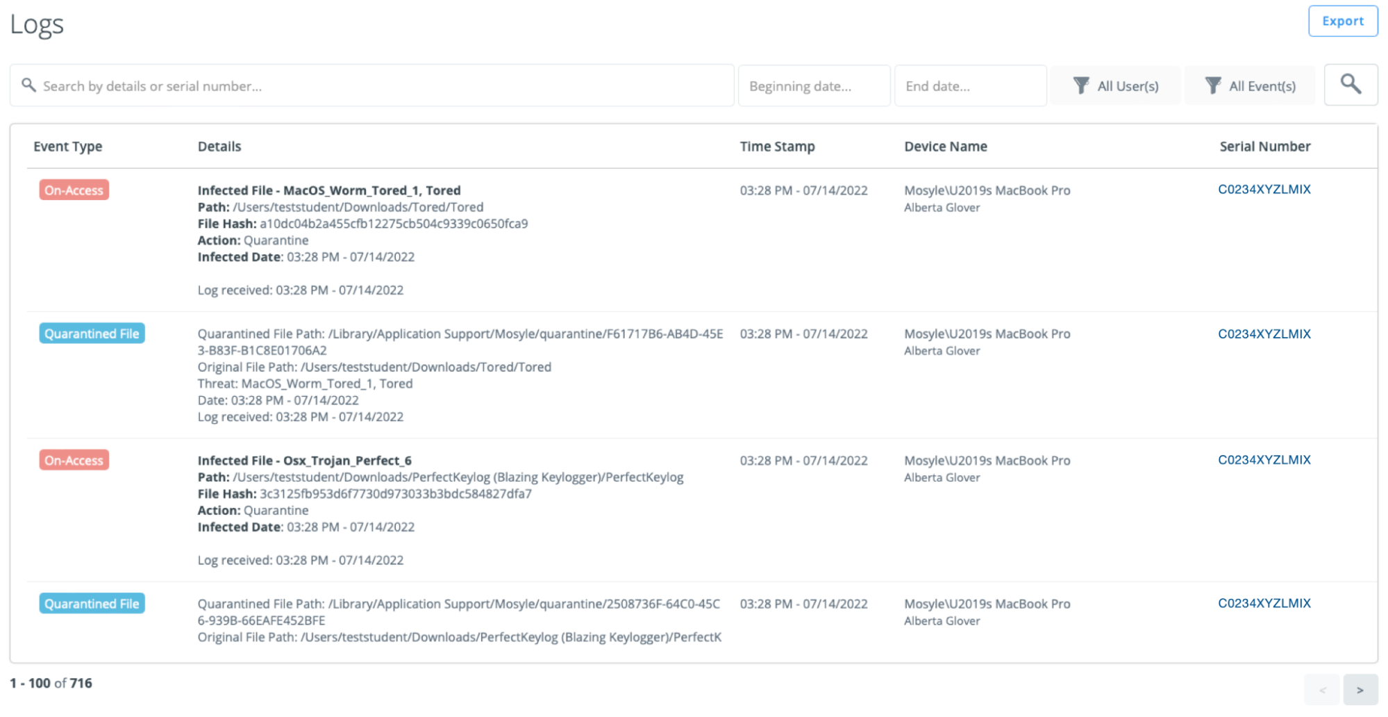View logs to see detailed info for when a device was scanned and if any infected files or threats were found. In addition to the scanned status, the event type, details regarding the file, date/time stamp, device name and serial number are listed. To export the logs, click “Export” in the upper right corner.