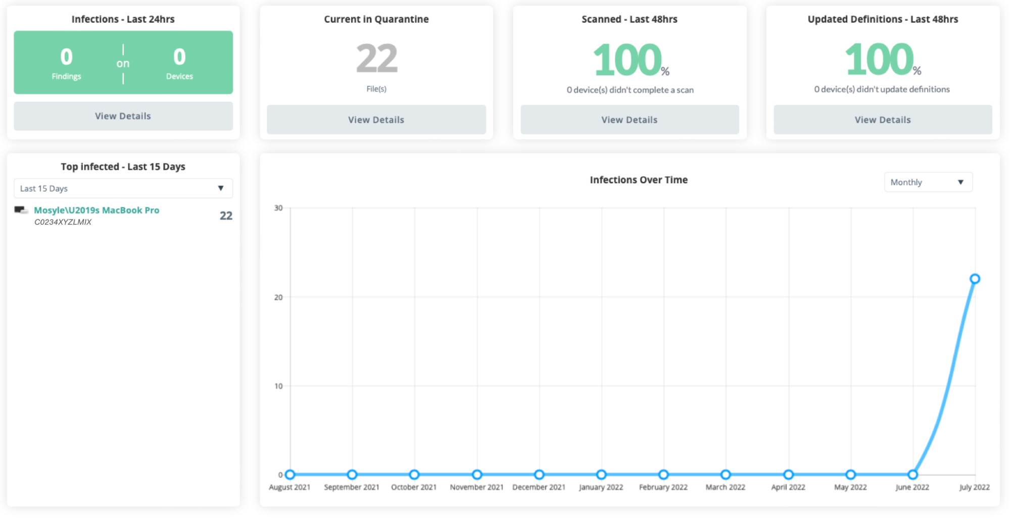 - Infections - Last 24 hours: Lists the number of findings on devices over the past 24 hours. Click View Details to check out the Logs.