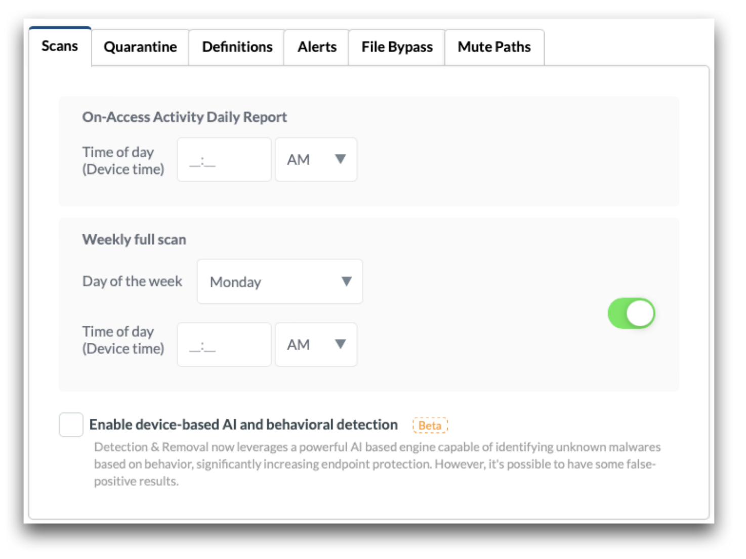 - Enable device-based AI and behavioral detection: Check the box to enable AI based detection of unknown malwares based on behavior.