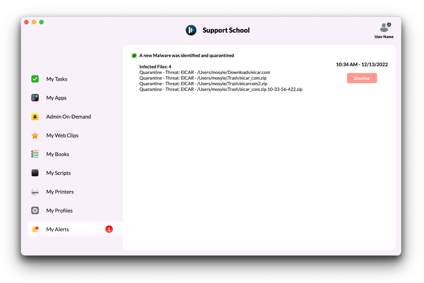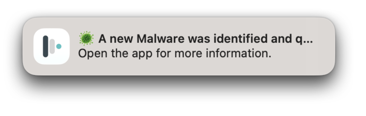 When an infection is detected, Administrators will see the infections in the Logs and in the device status view under Devices. End users will be alerted via a native macOS Notification as well as see an alert in the Manager application.