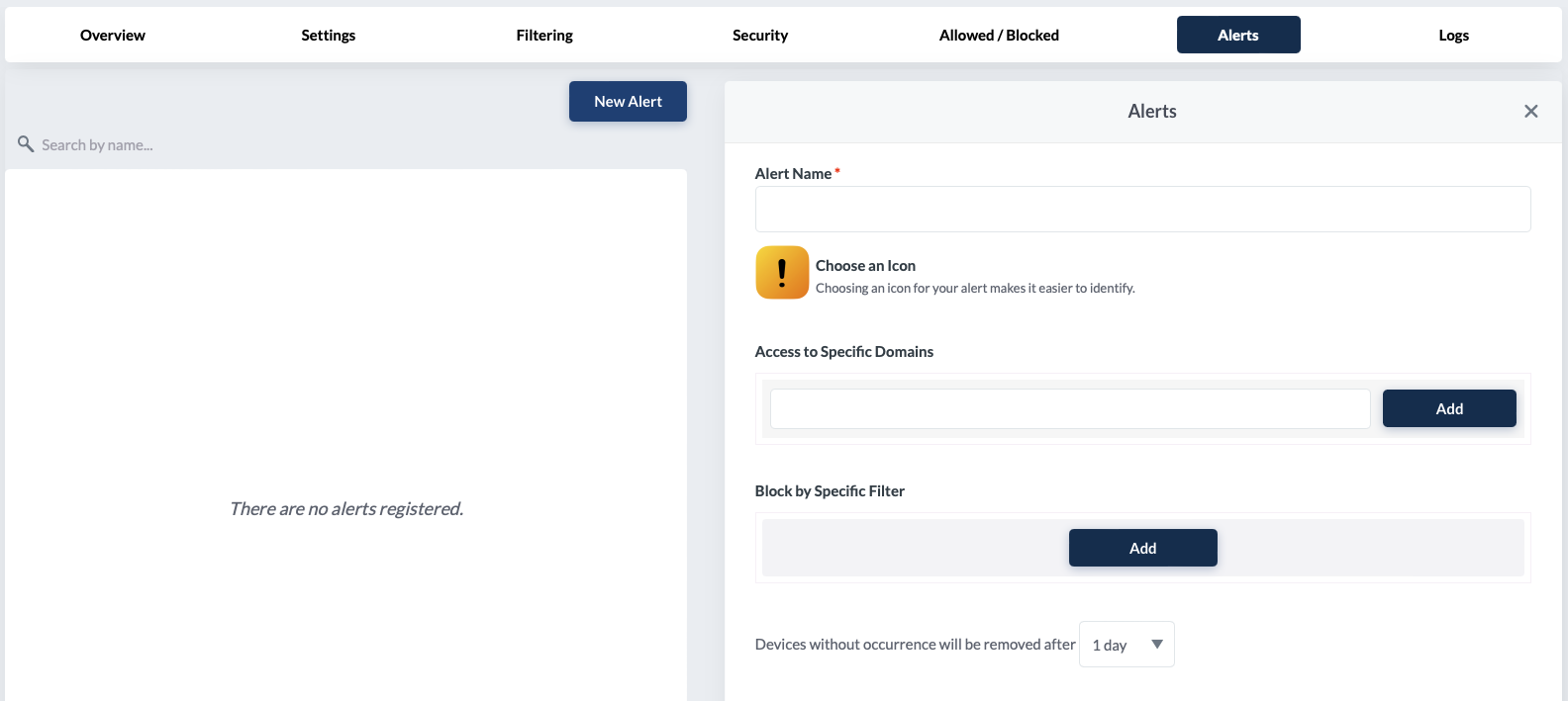 Configure to receive email alerts if users attempt to access a restricted domain, or attempt to access a site that is blocked due to its categorization. Choose how long devices will remain in the alerts until they are removed if there are no additional occurrences.