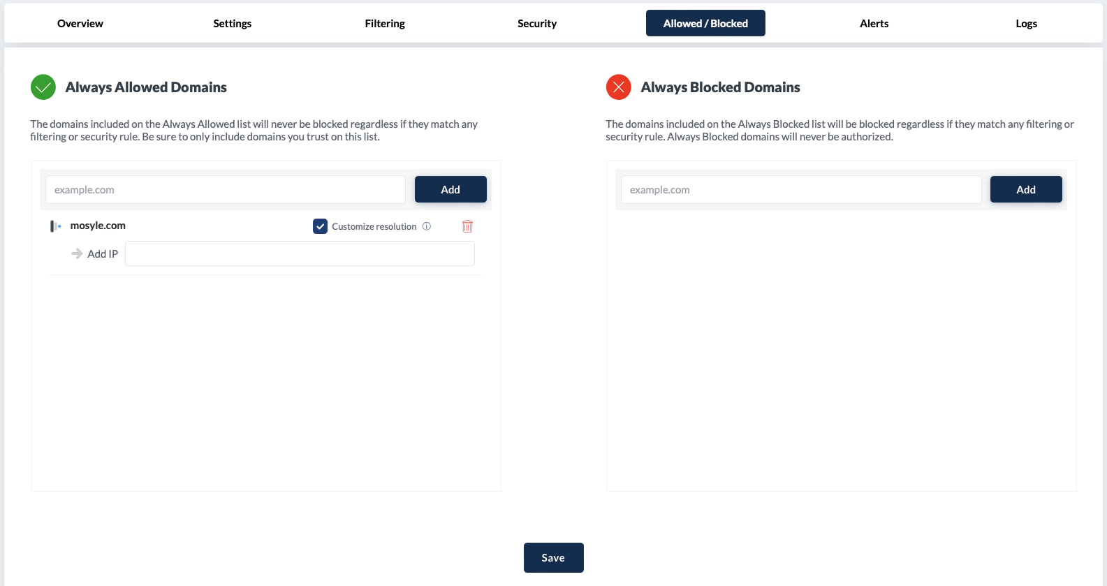 Customize specific domains that should be always allowed or always blocked, despite their categorization. Add domains that require custom resolution.