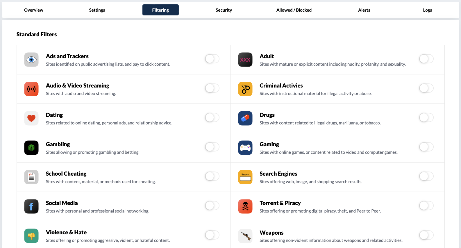 DNS Filtering provides Administrators an easy way to filter network traffic to ensure users are accessing approved sites. It is organized in 7 tabs: Overview, Settings, Filtering, Security, Allowed/Blocked, Alerts, and Logs.