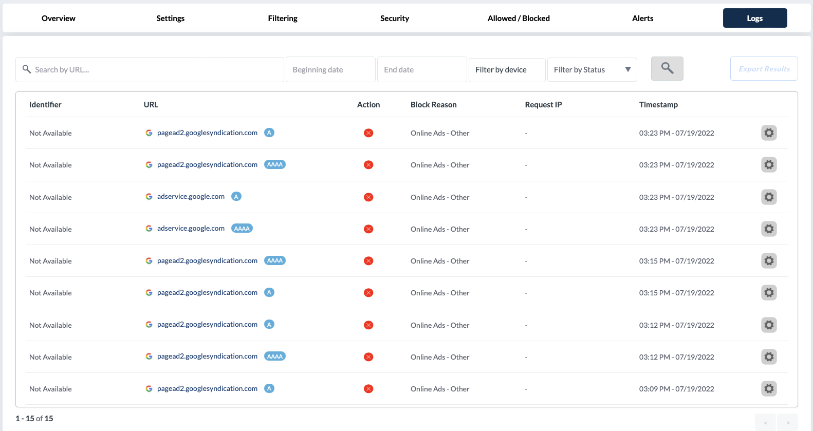 The logs can be filtered by specific URLs, dates, devices, or by status (allow/block). Once filtered, the results can be exported.