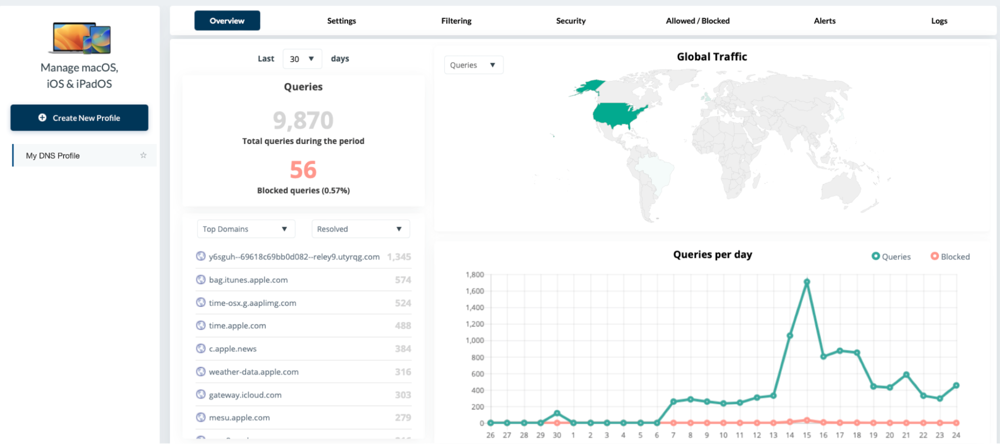 The Overview tab provides query data on the devices assigned to the individual profile. View the total number of queries, number of blocked queries, global traffic, number of queries per day, and filter by the list of top domains resolved and/or blocked.