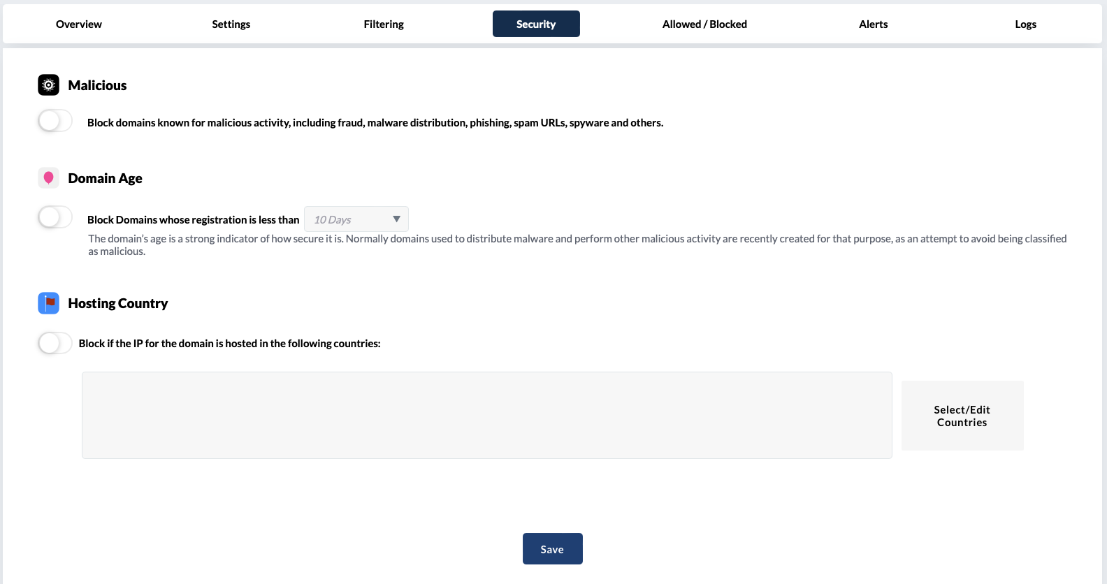 Configure the Security tab to block domains based on malicious activity, domain age, or hosting country.