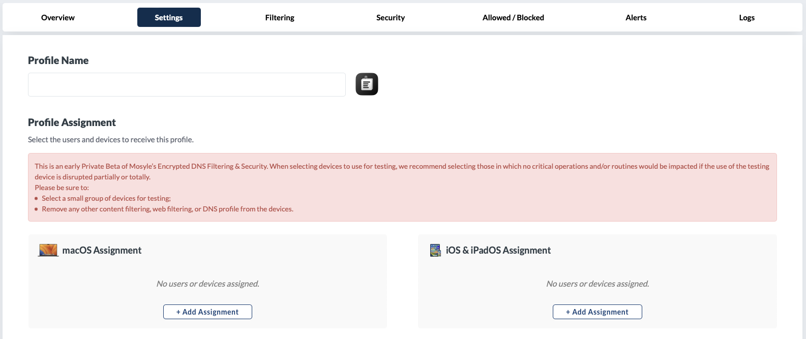 The Settings tab can be configured to specify Privacy & Logging settings, settings for macOS and iOS management, and any DNS Bypass rules. Assign the profile to the users/devices to be filtered. When using the DNS Filtering, it's strongly recommended not to apply any other content filtering solutions or profiles to avoid conflicts.