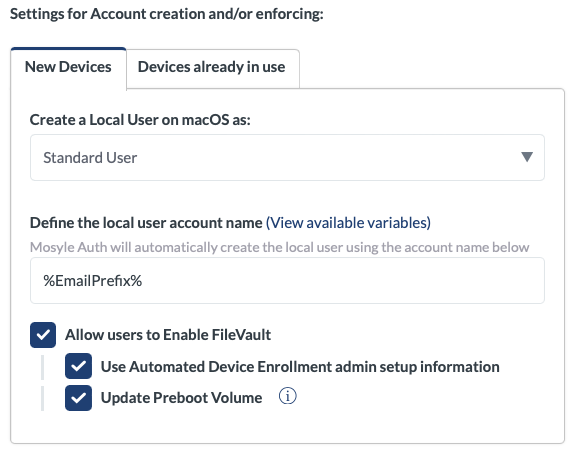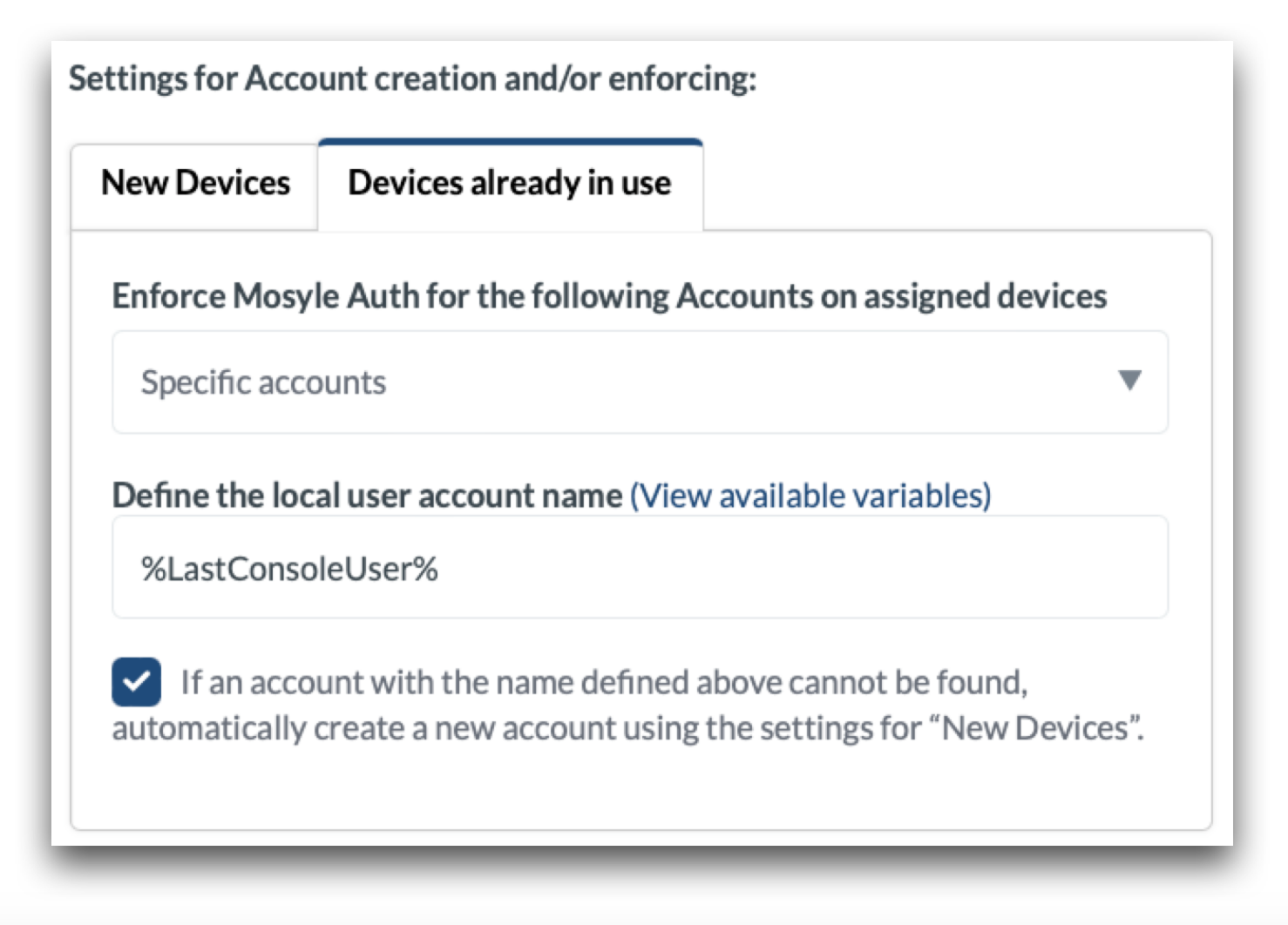 For devices already in use, such as devices that are already set up and have been in use, it's understood that user accounts already exist on the device. Therefore, it is undesirable for Mosyle Auth to create a new user account on the Mac. In order to avoid the creation of a new user account on the Mac, configure the “Devices already in use” tab.