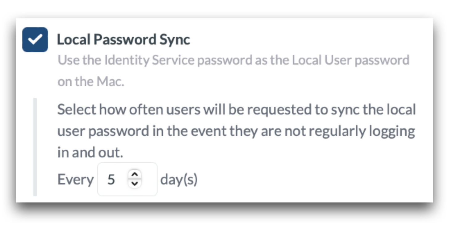 In all scenarios, Administrators have the ability to define the Local Password sync behavior. By default, Mosyle Auth will automatically compare the password used to authenticate during login with the saved password on the Mac. If the two passwords do not match, the user will be prompted to enter the password for the user account on the Mac, which is typically the previous IdP password, in order to update and sync the passwords. In the event users do not logout and login frequently, Administrators can define how often a user will be prompted to sync their password: