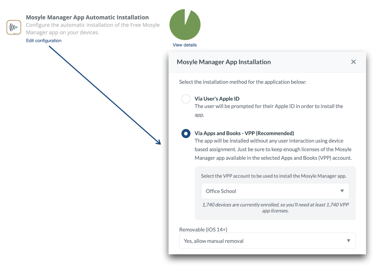 To configure the automatic installation of the Mosyle Manager app, first obtain licenses for the app in Apple School Manager. Once licenses are available and the Apps and Books token is integrated, go to Management > Install App (iOS/iPadOS) > Click Edit Configuration for the Mosyle Manager App Automatic Installation profile. Choose the Apps and Books token to use for licensing and assign the configuration to users/devices. Click Save.