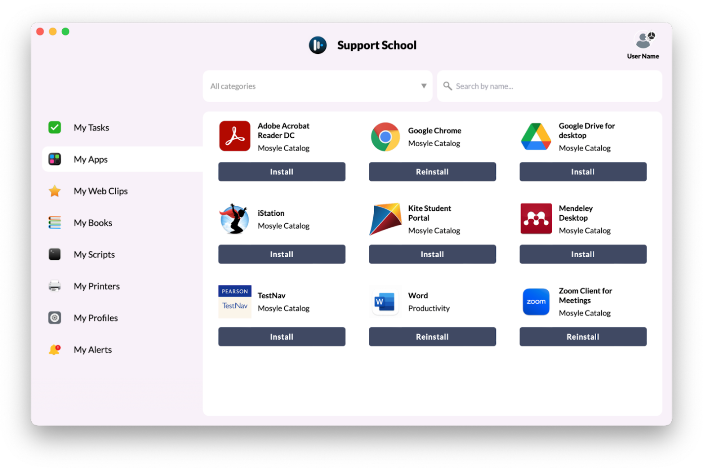 The Mosyle Self-Service is available for devices enrolled via Device Enrollment. Self-Service can be accessed using the Mosyle Manager app on iOS/iPadOS devices and through the Manager.app on macOS devices. Self-Service provides Administrators with the ability to allow end users to request the installation of apps, web clips, profiles, and more.