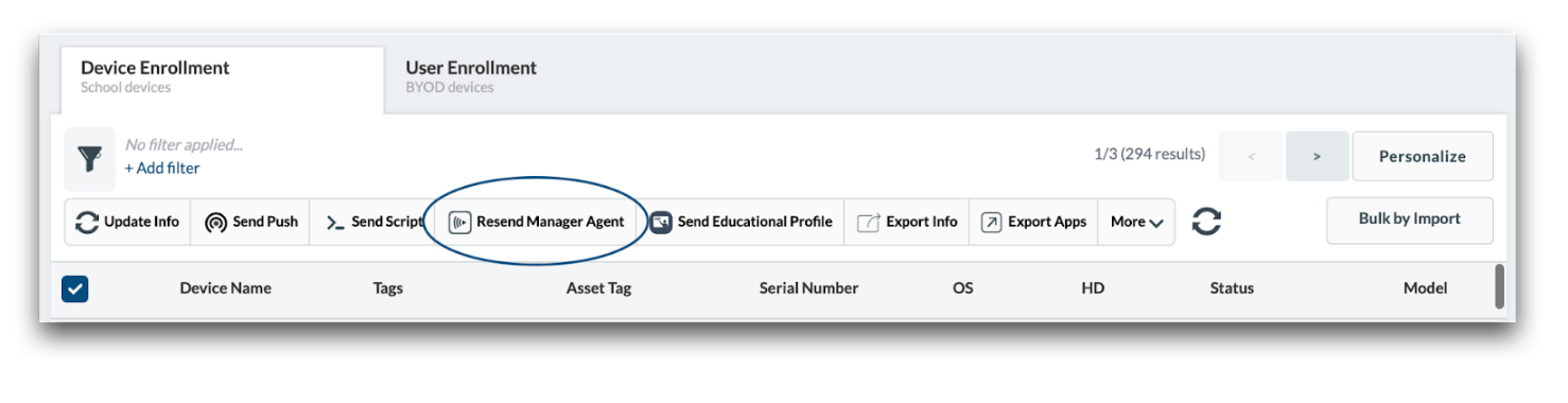The Manager.app is automatically installed on macOS devices enrolled using Automated Device Enrollment and Device Enrollment. If needed, it can be reinstalled on devices using the command in Management > Devices > Devices Overview > Resend Manager agent.