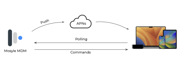 After a device is enrolled, the Mosyle MDM maintains communication using the Apple Push Notification service (APNs). Any time a command is generated or a profile is requested to be installed or removed, the MDM sends a push notification to the device via APNs to instruct the device to contact the MDM server. The device then contacts the MDM server to retrieve and act upon the command.